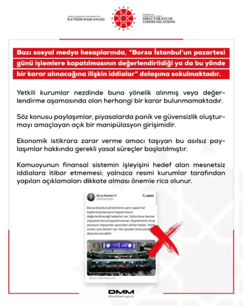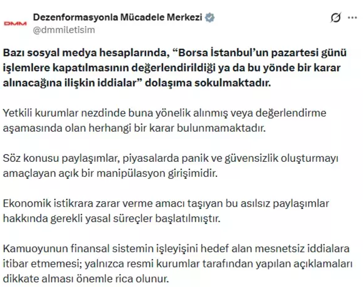 İlk açıklama, İletişim Başkanlığı Dezenformasyonla Mücadele Merkezi’nden (DMM) yapıldı. Açıklamada, “Borsa İstanbul’un pazartesi günü işlemlere kapatılmasının değerlendirildiği ya da bu yönde bir karar alındığı” yönündeki iddiaların gerçeği yansıtmadığı belirtildi.