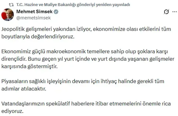 Piyasaların sağlıklı işleyişinin öncelik olduğunu vurgulayan Şimşek, ihtiyaç duyulması halinde gerekli tüm adımların atılacağını kaydetti. Vatandaşlara spekülatif haberlere itibar etmemeleri çağrısında bulundu.