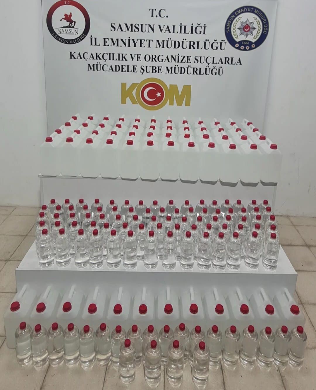 Samsun İl Emniyet Müdürlüğü Kaçakçılık ve Organize Suçlarla Mücadele (KOM) Şube Müdürlüğü ekiplerince İlkadım ilçesinde gerçekleştirilen operasyonda, sahte içki üretiminde kullanılan yüksek miktarda etil alkol ele geçirildi.