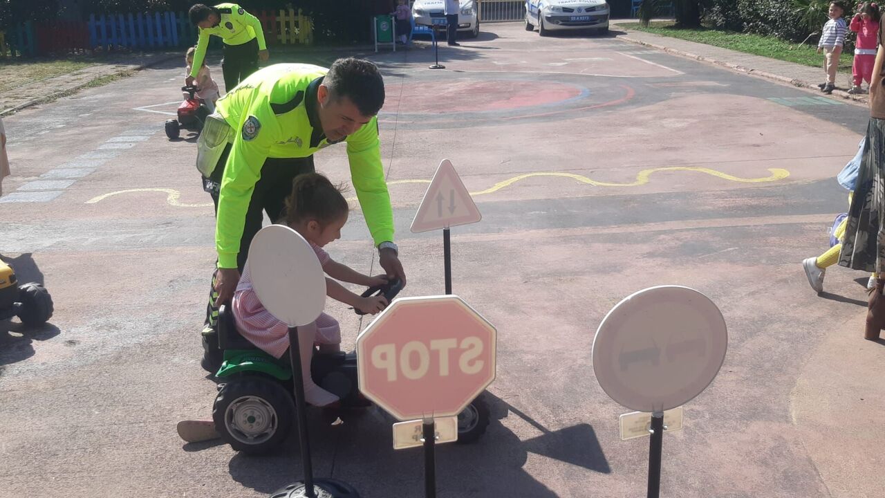 Salıpazarı Anaokulu'nun bahçesinde verilen eğitimde küçük çocuklara, trafik ışıkları, yaya geçidinden yolun karşısına geçme kuralları gibi bilgiler aktarıldı.