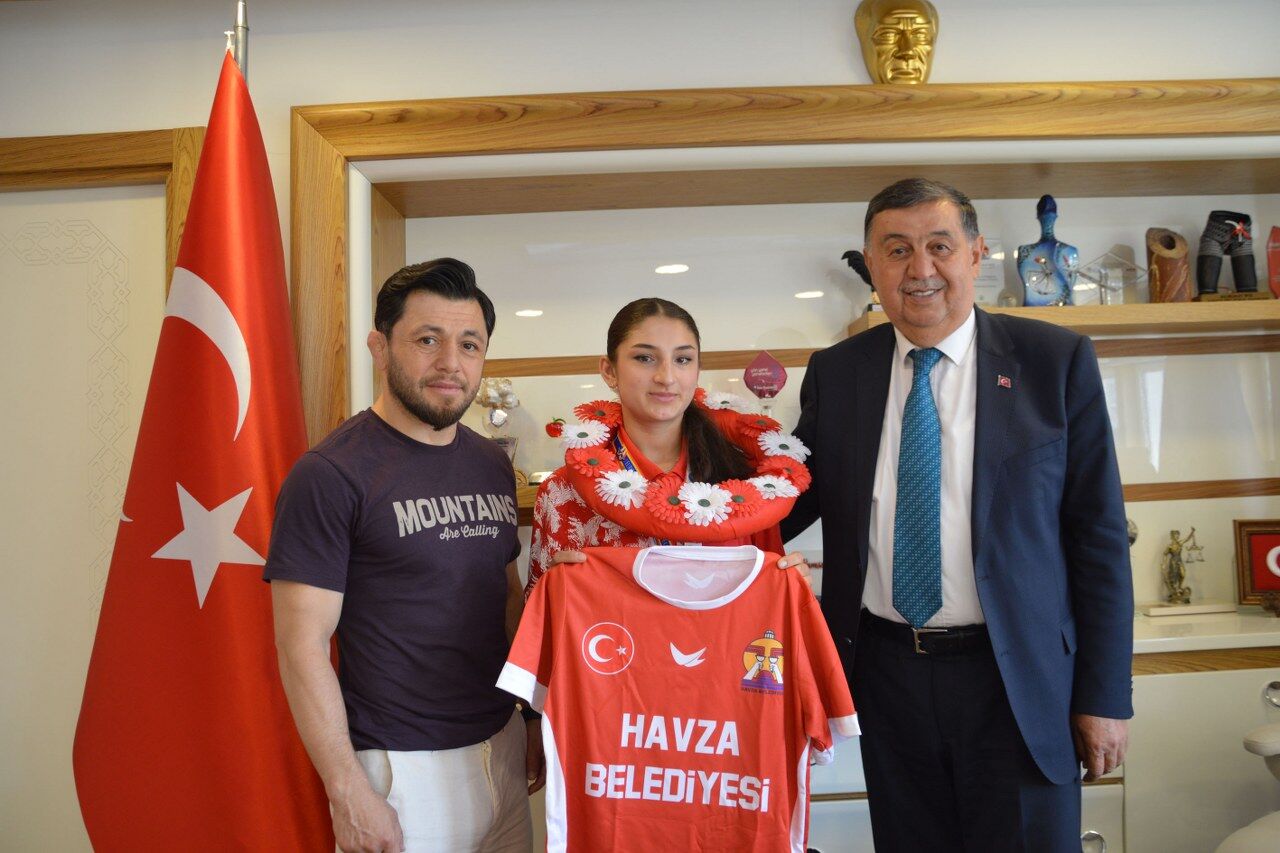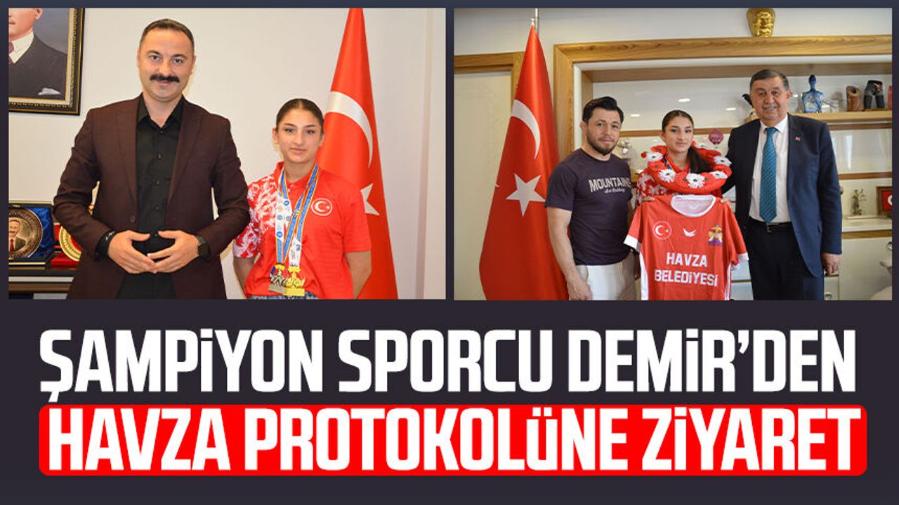 Avrupa ve dünya şampiyonu Şaziye Demir, aynı şampiyonada sol kol dördüncüsü olan Samet Akyüz, antrenörleri Murat Aktaş, Havza Milli Eğitim Şube Müdürü Turan Demir ve 25 Mayıs Anadolu Lisesi Müdürü Mahmut Bekdaş eşliğinde Havza Kaymakamı Mustafa Ayvat ve Havza Belediye Başkanı Murat İkiz’i makamlarında ziyaret etti.