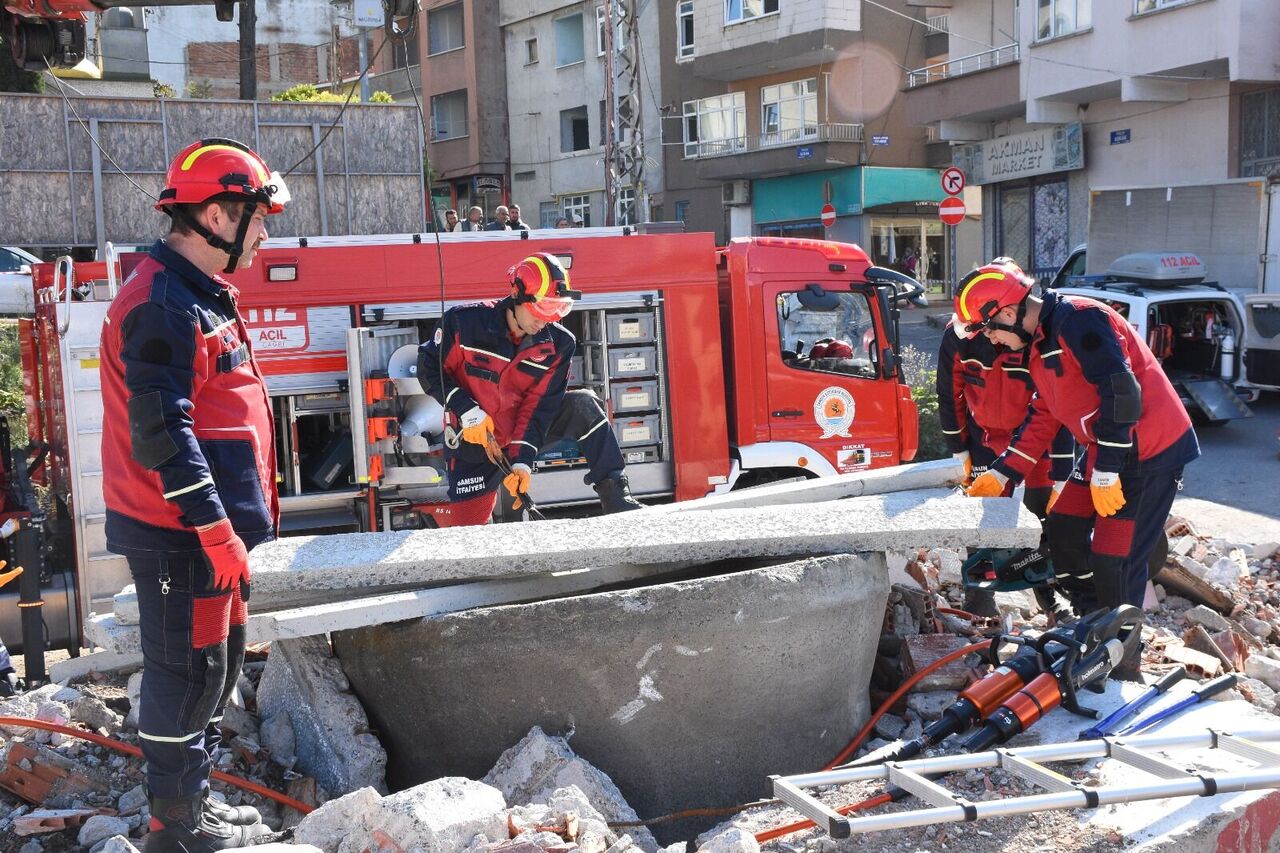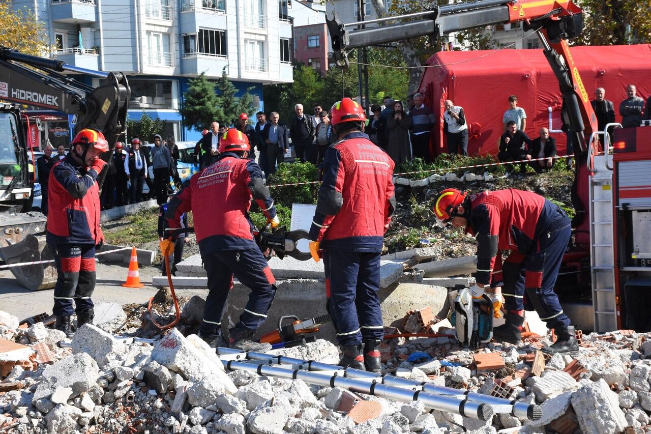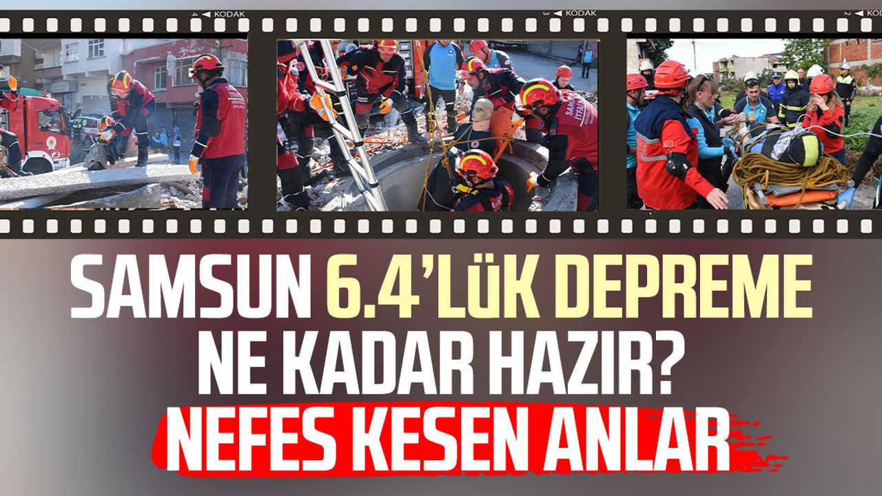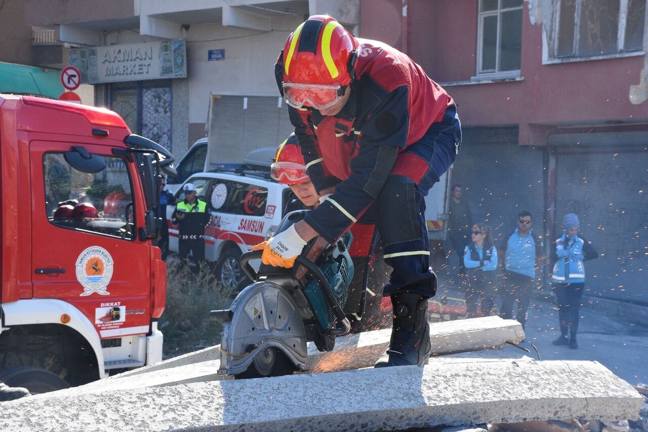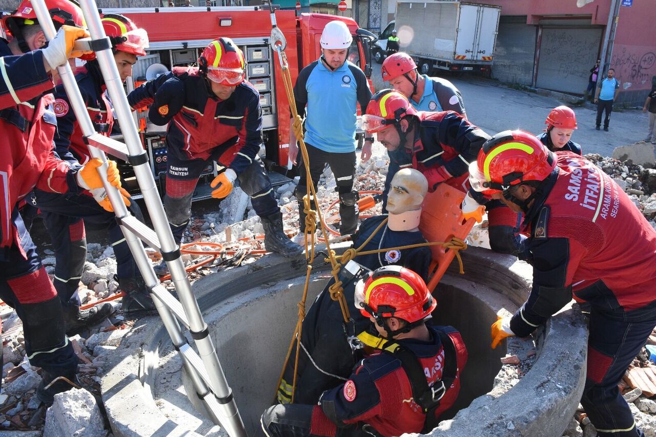Canik ilçesi Soğuksu Mahallesi'ndeki kentsel dönüşüm alanında gerçekleştirilen tatbikatta, senaryo gereği 6,4 büyüklüğündeki depremin ardından enkazda kalanların olduğu ve depremden kaynaklı bir binada yangın çıktığı ihbarı yapıldı.