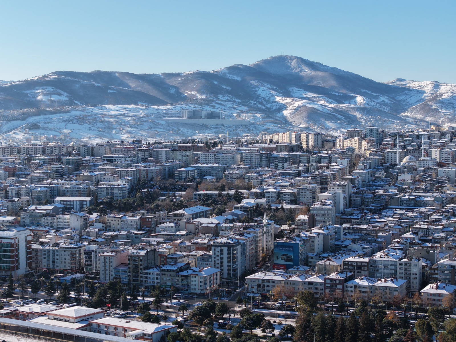 Kentte oluşan kar manzaraları sabah saatlerinde dron ile havadan görüntülendi. Görüntülerde beyaz örtüyle kaplanan binalar, meydanlar ve yollar dikkat çekti.