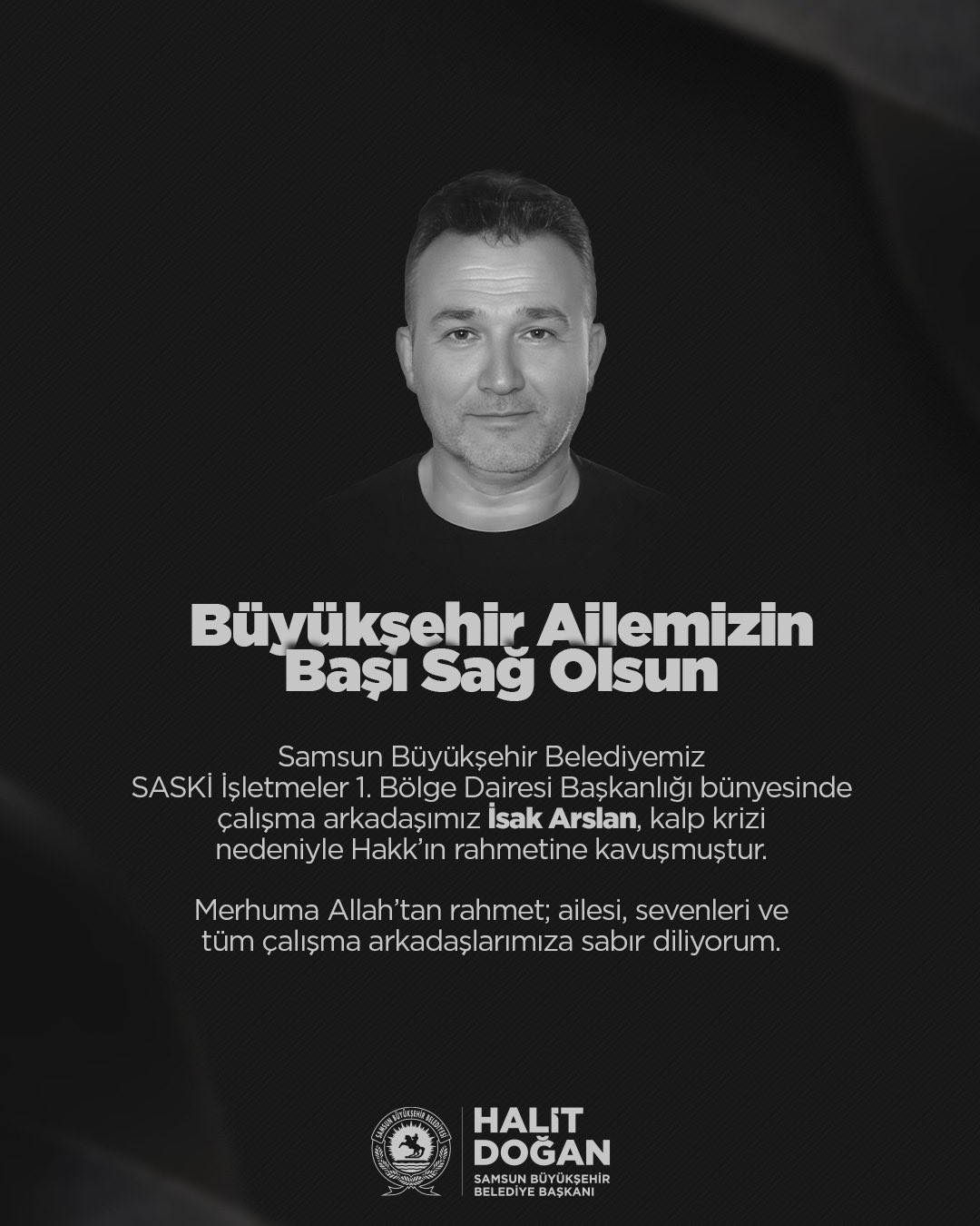 Samsun Büyükşehir Belediye Başkanı Halit Doğan, belediye bünyesinde görev yapan bir personelin vefat ettiğini duyurdu. Doğan, sosyal medya hesabından yaptığı paylaşımda, SASKİ çalışanı İsak Arslan’ın kalp krizi sonucu hayatını kaybettiğini açıkladı.