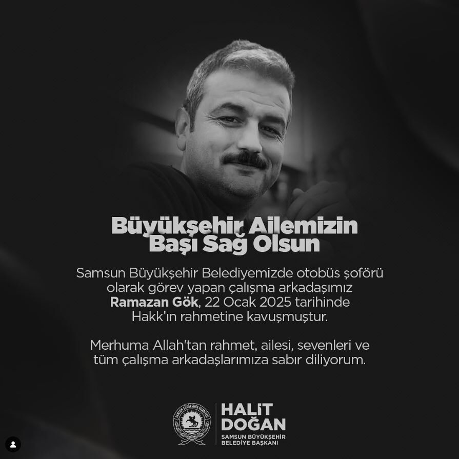 Samsun Büyükşehir Belediye Başkanı Halit Doğan, sosyal medya hesabından yaptığı paylaşımda, “ Samsun Büyükşehir Belediyemizde otobüs şoförü olarak görev yapan çalışma arkadaşımız Ramazan Gök, 22 Ocak 2025 tarihinde Hakk’ın rahmetine kavuşmuştur. Merhuma Allah’tan rahmet, ailesi, sevenleri ve tüm çalışma arkadaşlarımıza sabır diliyorum” ifadelerini kullandı.