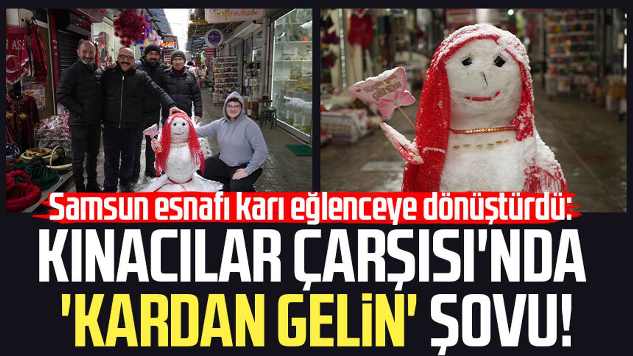Dört gündür yoğun kar yağışı etkisi altında kalan Samsun'da esnaf durumu eğlenceye çevirdi. İlkadım ilçesinde Kınacılar Çarşısı olarak bilinen arastada esnaf, 30 santim kalınlığına dayanan kar yağışını fırsat bilerek kardan gelin yaptı. Gelini 5'i bir yerde, bel kuşağı, duvak ve diğer eşyalarla kına gecesine hazırlayan esnafın kardan gelini, görenleri hem güldürdü hem de ilgisini çekti. Ayrıca kardan gelinin eline tutuşturulan "Kaptı gül gibi kızı" yazısı da dikkat çekti. Kardan gelini gören vatandaşlar özçekim yapmadan yanından ayrılmadı.