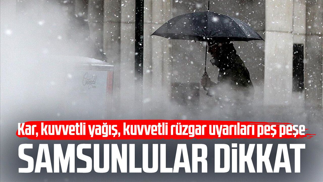 KUVVETLİ YAĞIŞ UYARISI: Bölgemiz genelinde devam eden yağışların öğle saatleri ile birlikte Samsun'un doğusu, Kastamonu ve Ordu kıyı kesimlerinde kuvvetli yağmur (21-50 kg/m2), Kastamonu ve Tokat'ın kuzeyi ile Ordu iç kesimlerinde kuvvetli ve yer yer yoğun kar yağışı şeklinde olacağı tahmin edildiğinden yaşanabilecek olumsuzluklara (Ani sel, Su baskını, Ulaşımda aksama vb.) karşı dikkatli ve tedbirli olunması gerekmektedir.