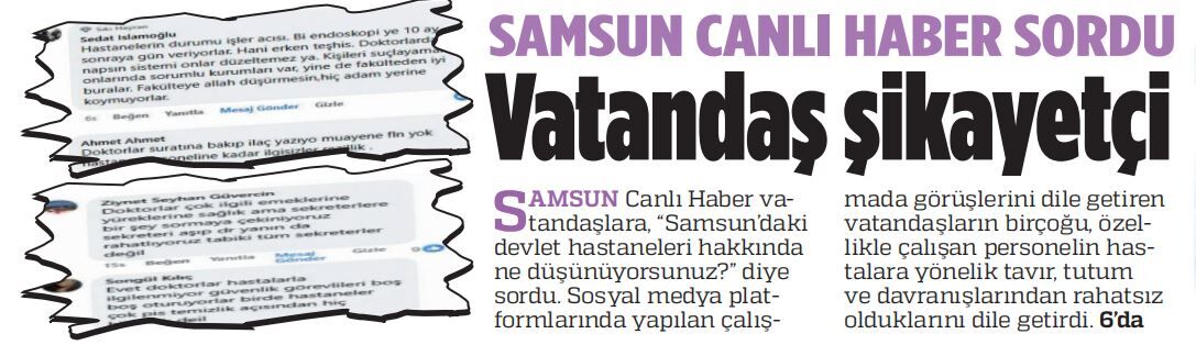 Samsun Canlı Haber vatandaşlara, "Samsun'daki devlet hastaneleri hakkında ne düşünüyorsunuz?" diye sormuştu. Görüşlerini dile getiren vatandaşların bir çoğu, özellikle çalışan personelin hastalara yönelik tavır, tutum ve davranışlarından rahatsız olduklarını ve hijyen konusunda da sorunlar yaşadıklarını dile getirmişti.