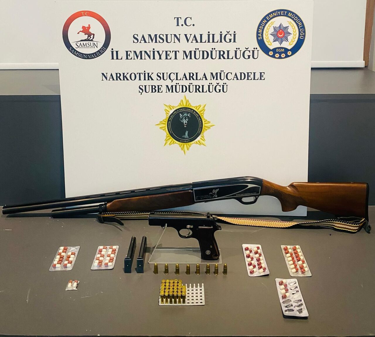 Narkotik Suçlarla Mücadele Şube Müdürlüğü ekipleri tarafından Samsun'un İlkadım ilçesinde düzenlenen operasyonda, C.C.K. (23) isimli şüphelinin ikametinde yapılan aramada uyuşturucu ve silah ele geçirildi.
