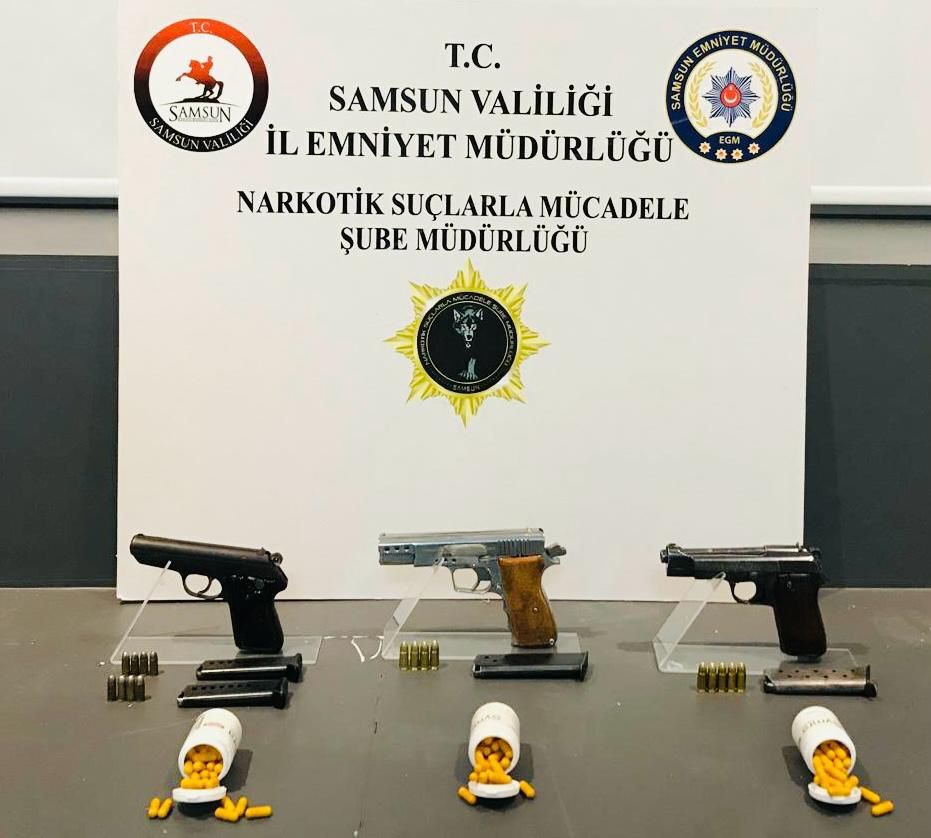 Samsun İl Emniyet Müdürlüğü Narkotik Suçlarla Mücadele Şube Müdürlüğü ekipleri, uyuşturucu ile mücadele kapsamında İlkadım ilçesinde belirlenen adreslere operasyon düzenledi. A.K. (29) ve K.A.M. (19) isimli şahıslara ait ikametlerde yapılan aramalarda 168 adet sentetik ecza hap, 3 adet ruhsatsız tabanca ve 17 adet tabanca fişeği ele geçirildi.