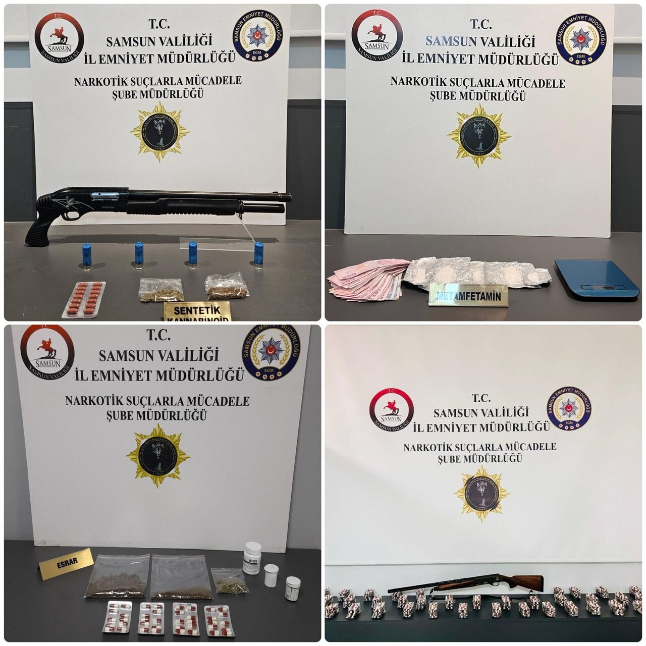 Gerçekleştirilen operasyonda; 5 bin 170 adet sentetik ecza, 107,70 gram toz esrar, 26,40 gram metamfetamin, 7 gram sentetik kannabinoid, 5 gram kokain, 4 adet uyuşturucu madde kullanım aparatı, 1 adet hassas terazi, 2 adet ruhsatsız tüfek, ve uyuşturucu madde ticaretinden elde edildiği değerlendirilen 6 bin 500 TL nakit para ele geçirildi.