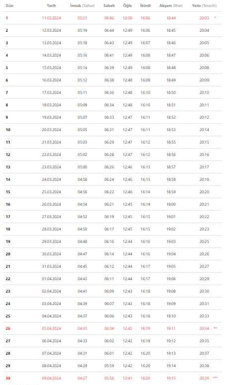 2024 Ramazan İmsakiye Diyanet İşleri Başkanlığı resmi internet sitesinden yayımlandı. İslam alemi, mübarek Ramazan ayına kavuşmanın mutluluğunu yaşıyor. On bir ayın sultanı bu yıl da sevinçle karşılanırken ilk iftar saati için bekleyiş başladı. 2024 Ramazan ayının gelmesiyle birlikte, Müslümanlar için iftar ve sahur saatlerini belirlemek önemli bir husus haline gelmiştir. Samsun'da iftar ve sahur saatleri de merak edilenler arasında yer alıyor.