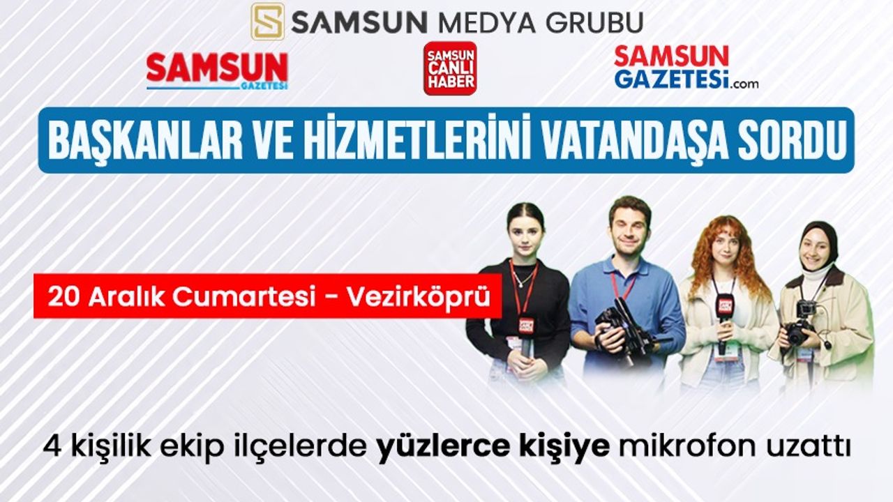 Samsun Medya Grubu, ilçelerde belediye başkanlarının görev sürecindeki çalışmalarını ve hayata geçirilen hizmetleri vatandaşlara sormak için kapsamlı bir saha çalışması başlattı. 12 Aralık Cuma günü Bafra ilçesiyle başlayan vatandaş değerlendirmeleri cumartesi Terme, pazartesi İlkadım ve salı günü Atakum’la devam etti. İlerleyen günlerde sırasıyla Çarşamba, Tekkeköy ve Salıpazarı ilçeleri sokak röportajları yayınlandı. 20 Aralık Cumartesi günü de Vezirköprü'de gerçekleştirilen sokak röportajı yayında olacak.