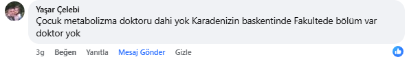 Karadeniz Bölgesi’nin en büyük üniversite hastanesi olmasına rağmen branş doktoru eksikliği de önemli bir problem. Çocuk metabolizma alanında doktor bulunmadığını vurgulayan Yaşar Çelebi, “Bölüm var ama doktor yok” diyerek sağlık hizmetinin yetersizliğine dikkat çekiyor.