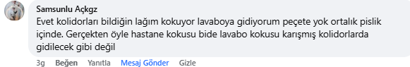 Vatandaşların ortak şikayeti hastanedeki hijyen yetersizliği. “Koridorları bildiğin lağım kokuyor” diyen bir hasta yakını, lavabolarda peçete ve sabun dahi bulunmadığını, temizlikten eser olmadığını belirtiyor. Tuvaletlerin rezil halde olduğunu söyleyen Sayime Okumuş, “Çeşmeler hep arızalı, şifonlar ya akıyor ya çalışmıyor” diyerek altyapı sorunlarına dikkat çekiyor.