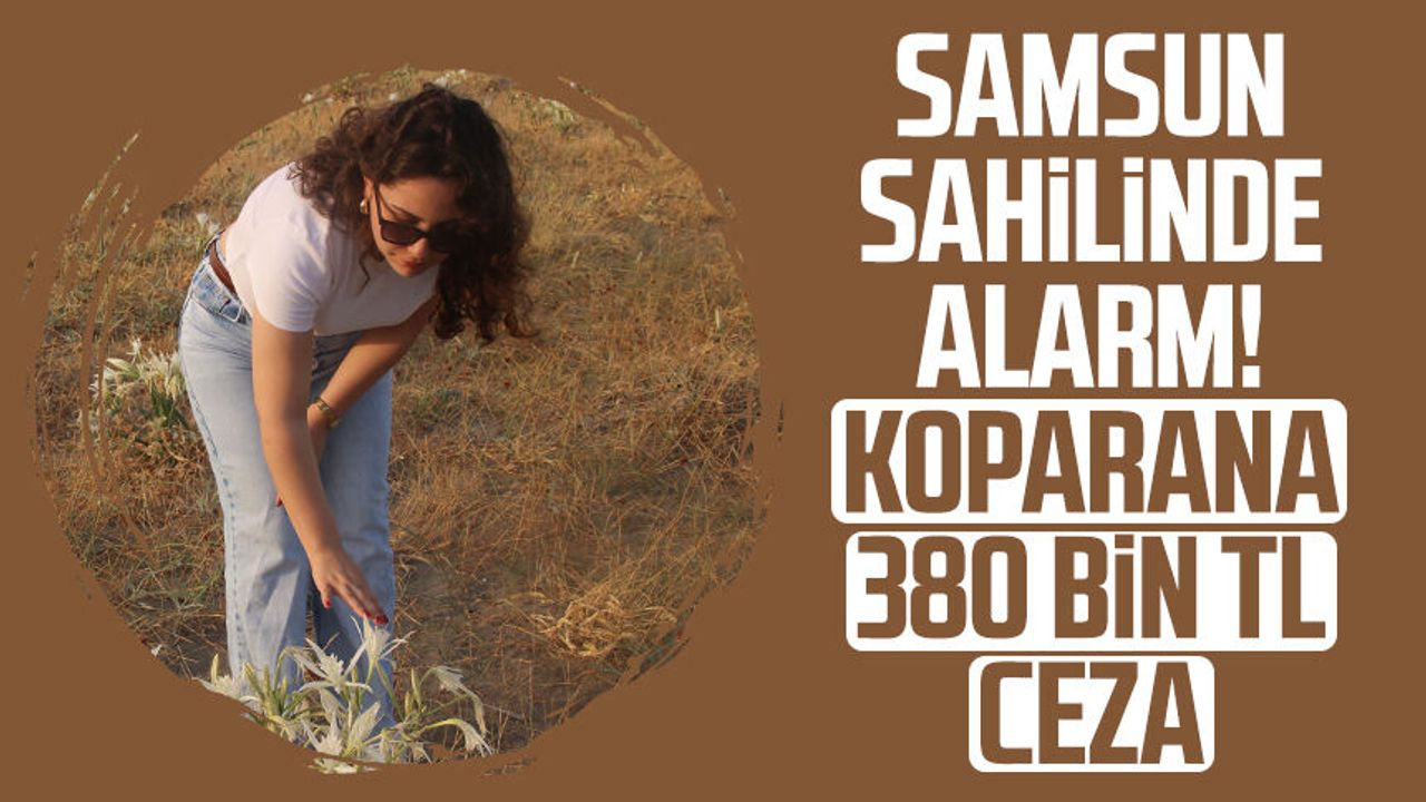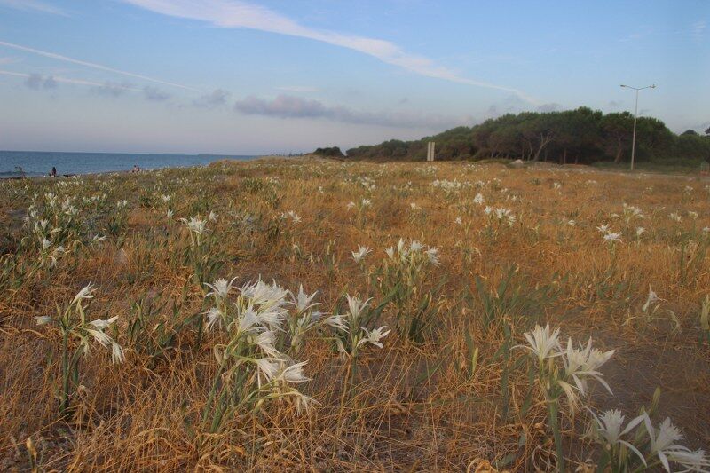 Geyikkoşan sahilini de beyaza bürüyen kum zambaklarını sökenlere Çevre Kanunu kapsamında 380 bin TL'ye kadar para cezası veriliyor.