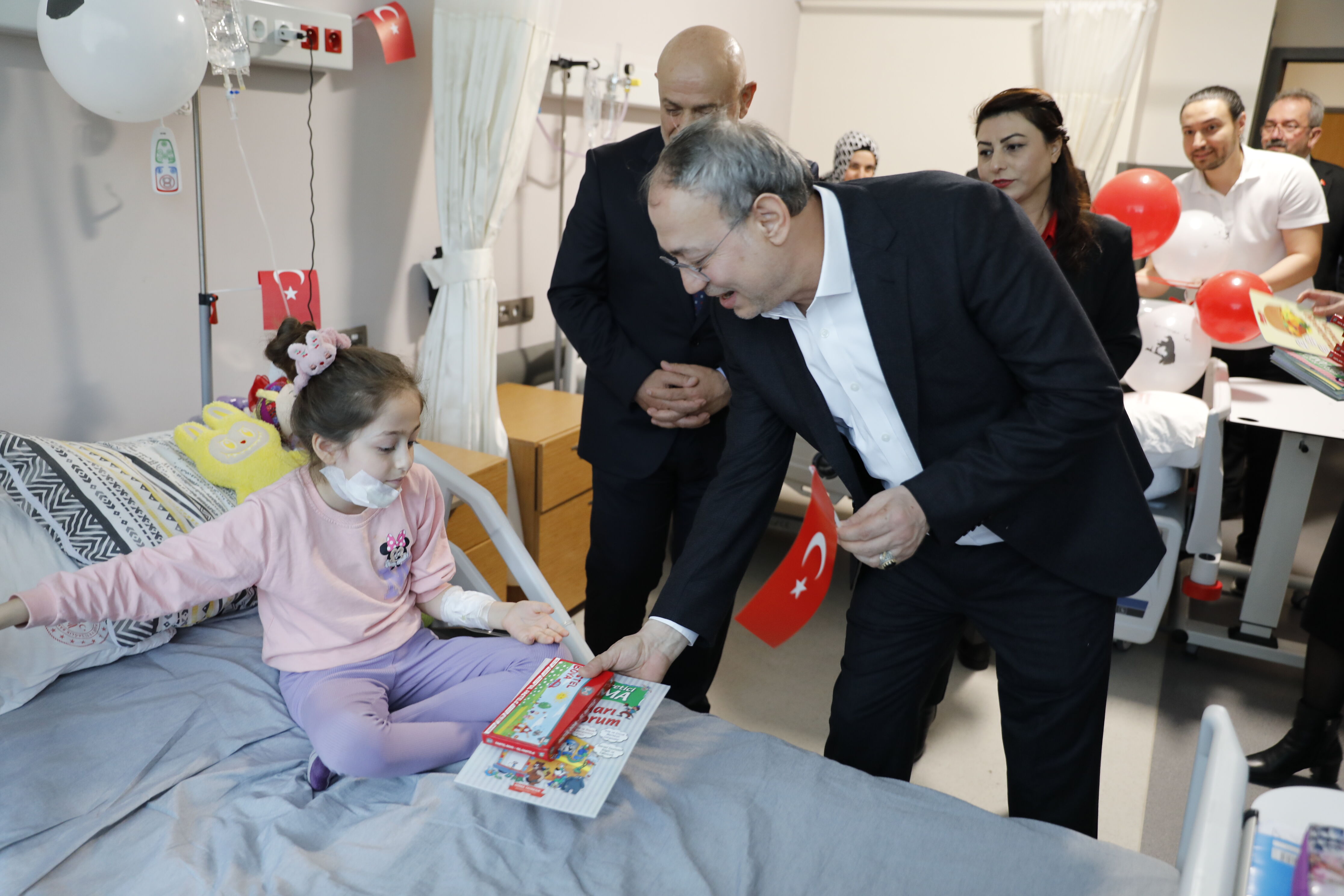 Çocuk servisinde 23 Nisan Ulusal Egemenlik ve Çocuk Bayramı dolayısıyla düzenlenen etkinliğe katılan Topsakal, çocuklara Türk bayrağı, balon ve kırtasiye malzemeleri dağıttı.