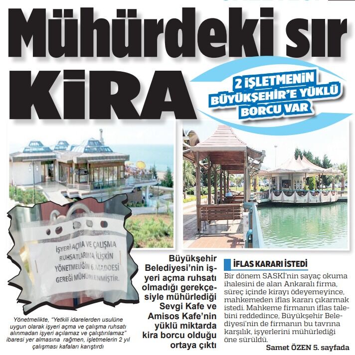 Samsun Büyükşehir Belediye Meclisi toplantısında CHP Grup Başkanvekili Hasan İpek'in mühürlenen Sevgi Kafe ve Amisos Kafe konusunu sorması üzerine açıklama yapan Başkan Mustafa Demir, kiralama ihalesini alan firmanın konkordato ilan ettiğini, bu nedenle de süreci iyi yönetemediği için hijyenik olmadığı gerekçesiyle kapatıldığını söyledi.