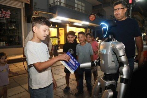 Canik Belediyesi'nin ilçede gerçekleştireceği Türkiye'nin en büyük yapay zekâ festivali CANİKFEST Yapay Zekâ Yolculuğu'nda sahne alacak insansı robot CANİKFESTMAN, festival öncesi Canik sokaklarında vatandaşlarla buluştu.