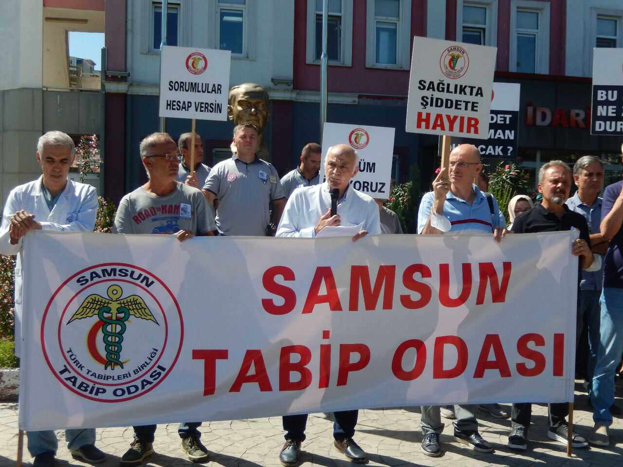 Gazi Devlet Hastanesi'nde bir araya gelen sağlık çalışanları, 'Sağlıkta şiddete hayır', 'Çözüm istiyoruz', 'Bu şiddet ne zaman duracak?' dövizleriyle saldırıyı protesto etti. Hastane önünde basın açıklaması gerçekleştiren Samsun Tabip Odası Başkanı Dr. Faysal Çadır, "Biz sağlık emekçileri olarak bu şiddet sarmalının genişlemesi karşısında siyasi iktidarı defalarca uyardık. Sağlık kurumlarında meydana gelen saldırıların artışı nedeniyle önlemler alınmasına, 6136 sayılı yasada değişiklik yapılmasına ilişkin önerilerde bulunduk. Ancak tüm uyarılarımız görmezden gelindi. Ülkede artan şiddet iklimi bizlerin sadece çalışma koşullarını bozmakla kalmamış can güvenliğimiz de ortadan kaldırmıştır" dedi.