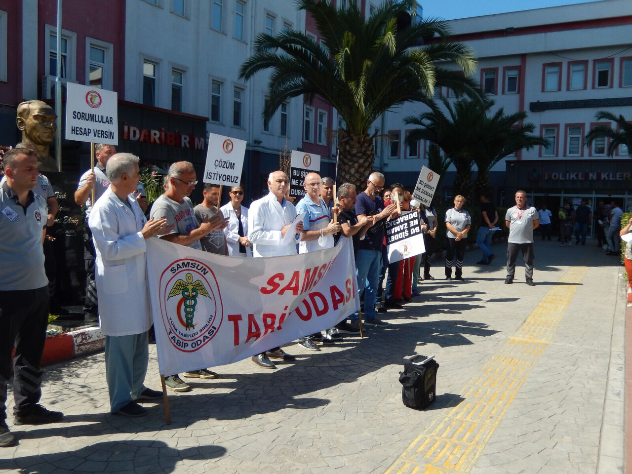 Samsun Tabip Odası, İstanbul Esenyurt Necmi Kadıoğlu Devlet Hastanesi’nde hasta yakınları tarafından boynundan bıçaklanarak hayatını kaybeden güvenlik görevlisi Tuğrul Okudan'a gerçekleştirilen saldırıya tepki göstererek, eylem yaptı.
