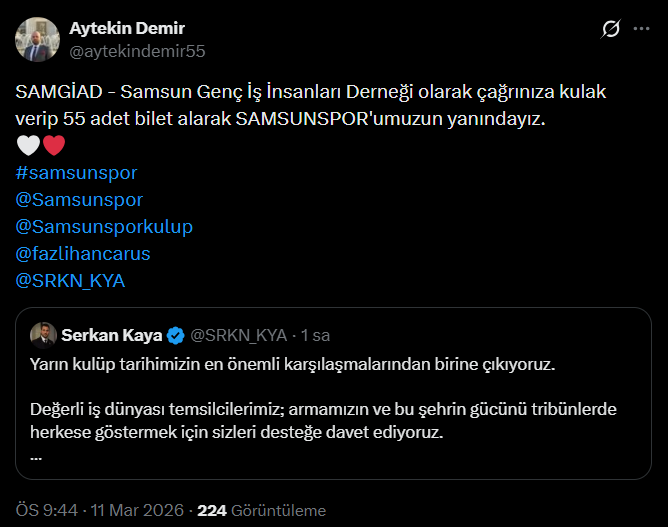 "Serkan Kaya çağrınıza destek veriyoruz. 55 biletle Atatürklü Armanın yanındayız… Şehrimizle, taraftarımızla, armamızla hep birlikte! Samsunsporumuza Avrupa arenasında başarılar diliyoruz."