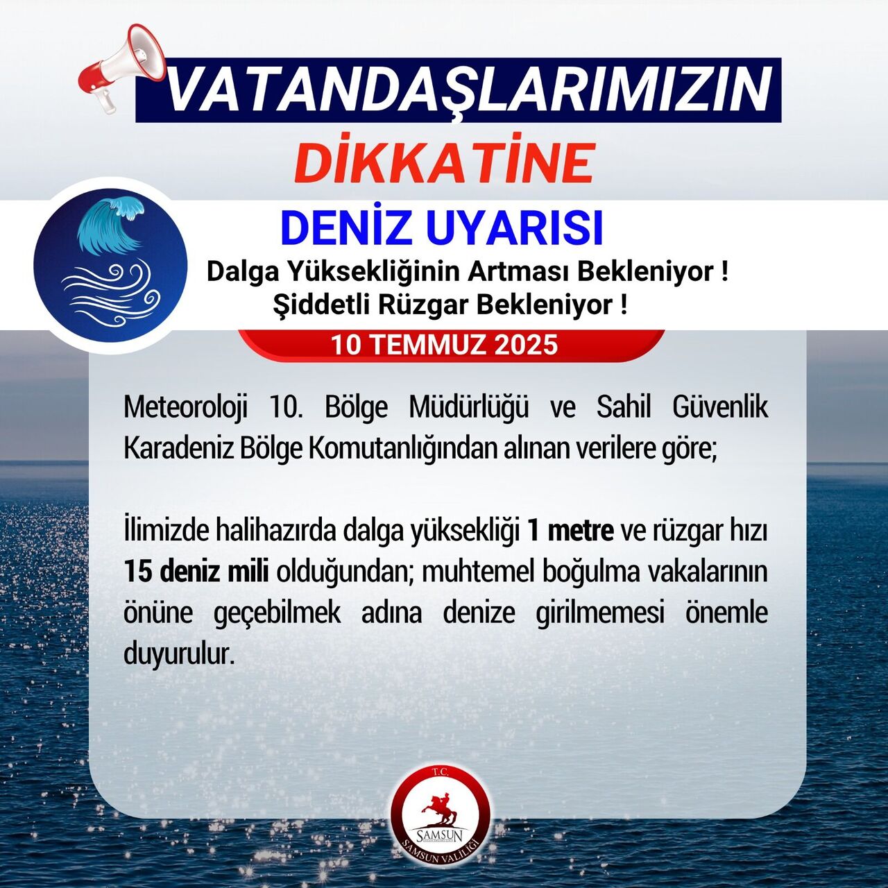 “İlimizde halihazırda dalga yüksekliği 1 metre ve rüzgar hızı 15 deniz mili olduğundan; muhtemel boğulma vakalarının önüne geçebilmek adına denize girilmemesi önemle duyurulur.”