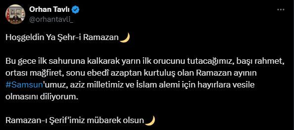 Ramazan ayının manevi atmosferine dikkat çeken Vali Orhan Tavlı, bu mübarek günlerin birlik ve beraberliği pekiştirmesi temennisinde bulundu. Vali Tavlı, paylaşımında şu ifadelere yer verdi: "Bu gece ilk sahuruna kalkarak yarın ilk orucunu tutacağımız, başı rahmet, ortası mağfiret, sonu ebedî azaptan kurtuluş olan Ramazan ayının Samsun'umuz, aziz milletimiz ve İslam alemi için hayırlara vesile olmasını diliyorum. Ramazan-ı Şerif'imiz mübarek olsun." ifadelerini kullandı.
