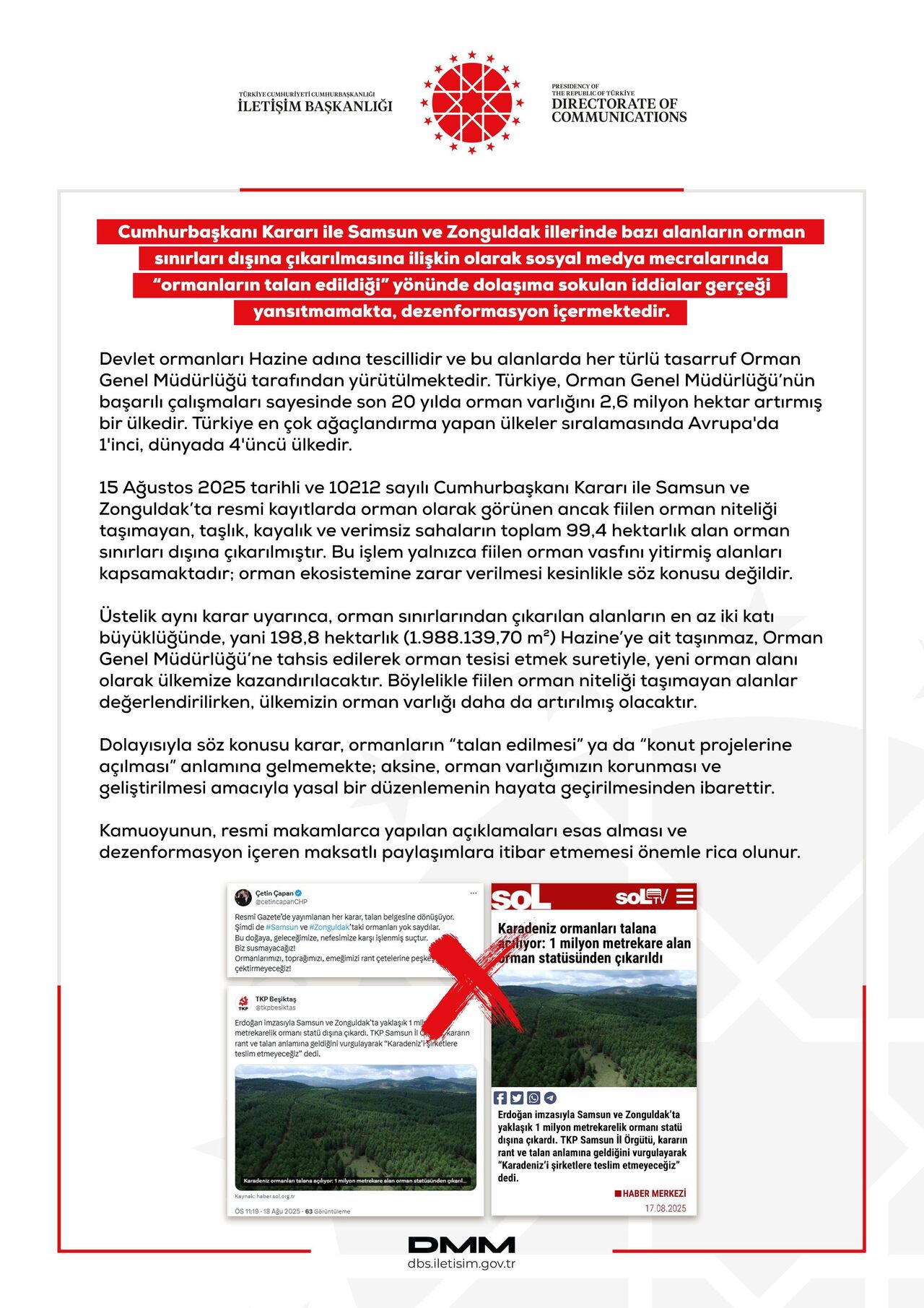 Merkezden yapılan duyuruda, söz konusu paylaşımların gerçeği yansıtmadığı belirtilerek, “Karar; ormanların talan edilmesi ya da konut projelerine açılması amacı taşımamaktadır. Aksine, orman varlığının korunması ve geliştirilmesi amacıyla çıkarılmış yasal bir düzenlemedir.” denildi.