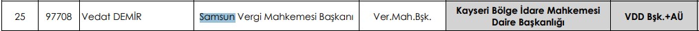 Vedat Demir Samsun Vergi Mahkemesi Başkanı Kayseri Bölge İdare Mahkemesi Daire Başkanı (VDD Bşk. + AÜ)