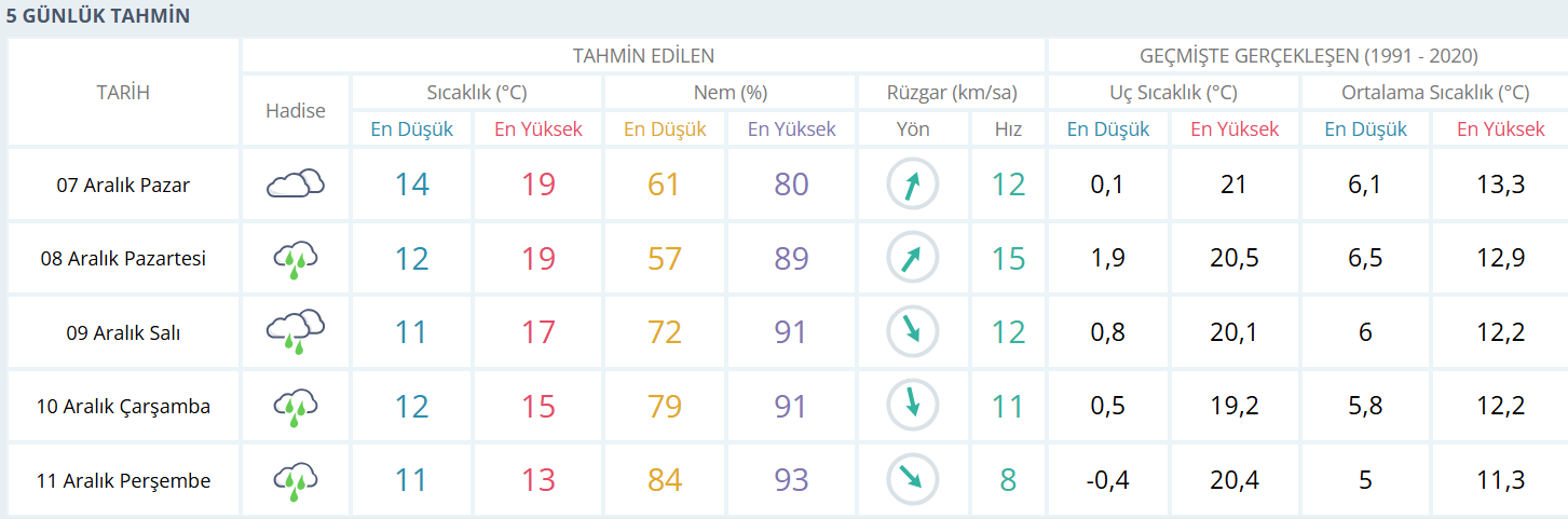 7 Aralık Pazar günü kent genelinde çok bulutlu bir hava beklenirken sıcaklıkların 14 ile 19 derece arasında seyredeceği tahmin ediliyor.
