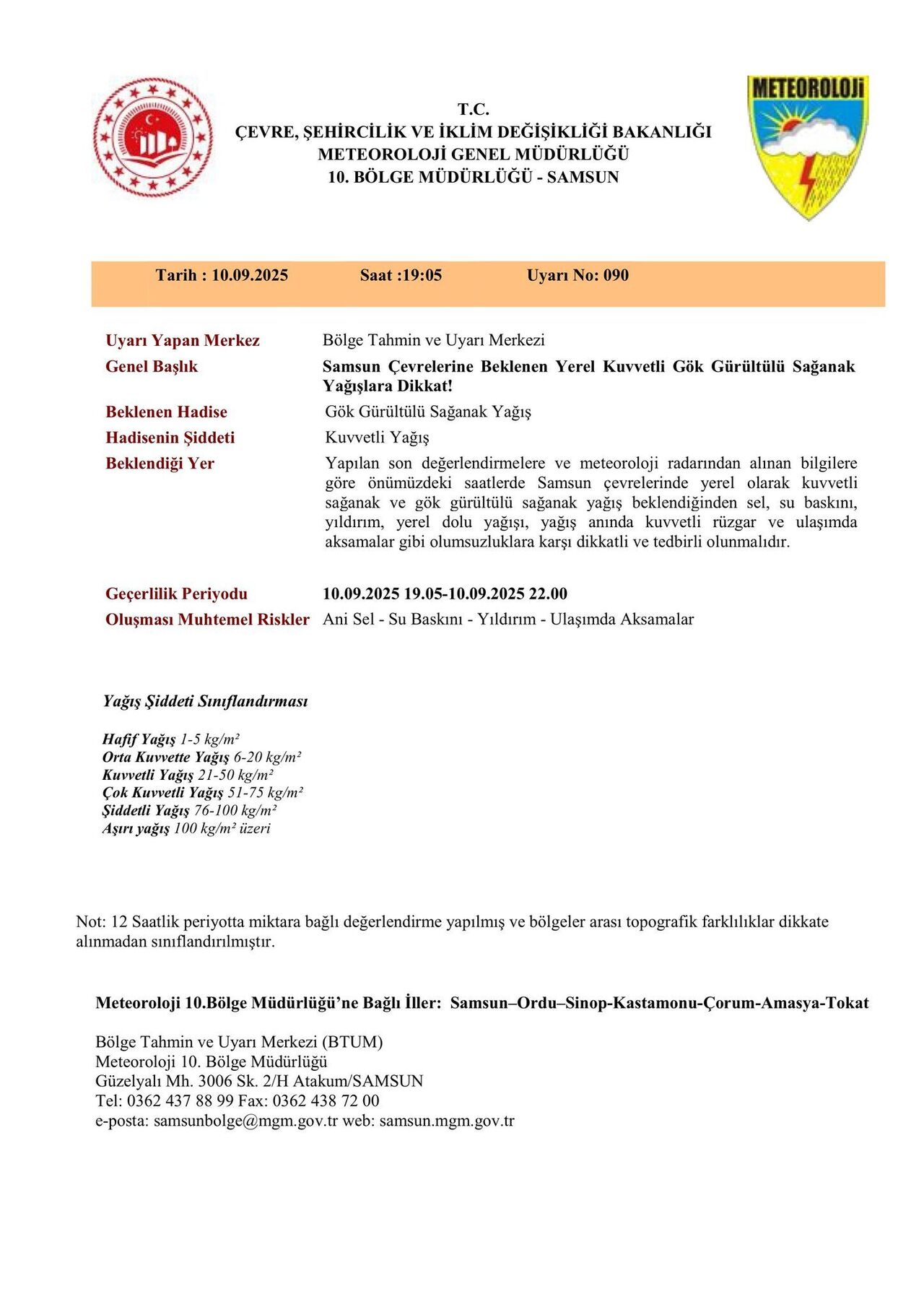 Meteoroloji 10. Bölge Müdürlüğü, Samsun çevrelerinde önümüzdeki saatlerde yerel olarak kuvvetli gök gürültülü sağanak yağış beklendiğini duyurdu.
