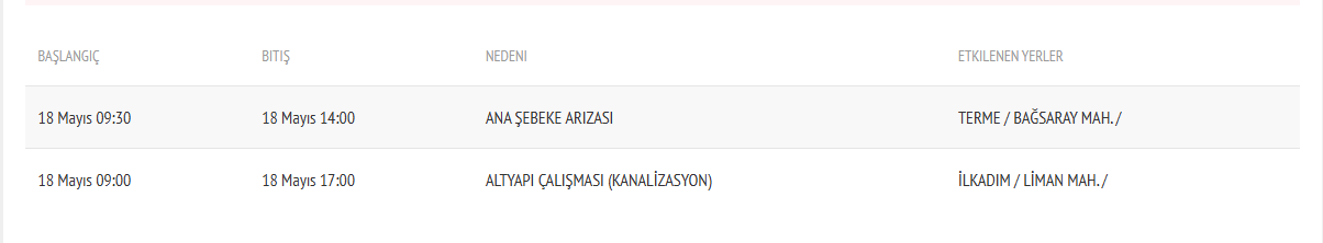 Samsun Büyükşehir Belediyesi Su ve Kanalizasyon İdaresi (SASKİ), 18 Mayıs Pazar günü Terme ve İlkadım ilçelerinde yapılacak çalışmalar nedeniyle bazı bölgelerde geçici kesintiler yaşanacağını duyurdu.