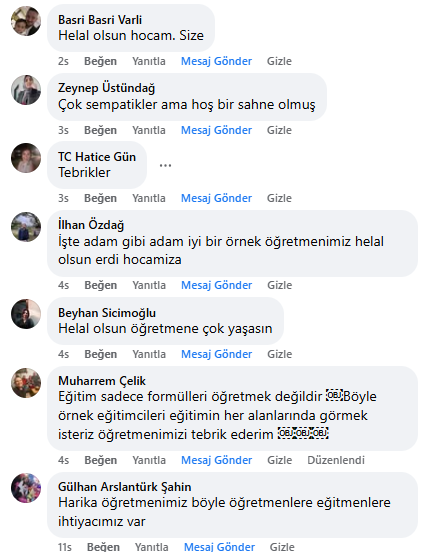 Kullanıcılardan Basri Varlı, “Helal olsun hocam,” sözleriyle takdirini dile getirirken, Zeynep Üstündağ ise, “Çok sempatikler ama hoş bir sahne olmuş,” yorumunu yaptı. Muharrem Çelik ise, “Eğitim sadece formülleri öğretmek değildir. Böyle örnek eğitimcileri eğitimin her alanlarında görmek isteriz,” sözleriyle öğretmeni tebrik etti. Çiğdem Adem Soysal da, “Bu öğretmenimiz çocuklara sevgisini ve güveni vermiş. Asla unutulmayacak bir 23 Nisan hediyesi olmuş,” ifadelerini kullandı.