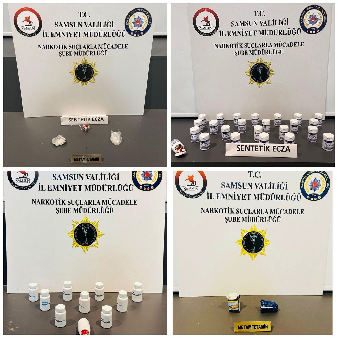 Yapılan operasyonda; 2 bin 96 adet sentetik ecza, 90 gram metamfetamin, 22 gram kokain, 2,41 gram sentetik kannabinoid, 4 adet sentetik kannabinoid emdirilmiş peçete, 2 adet uyuşturucu madde kullanım aparatı ele geçirildi.