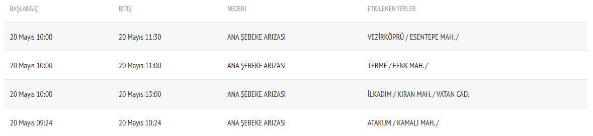 Terme / Fenk Mahallesi: 10:00 ile 11:00 saatleri arasında ana şebeke arızası nedeniyle su kesintisi yaşanacak.