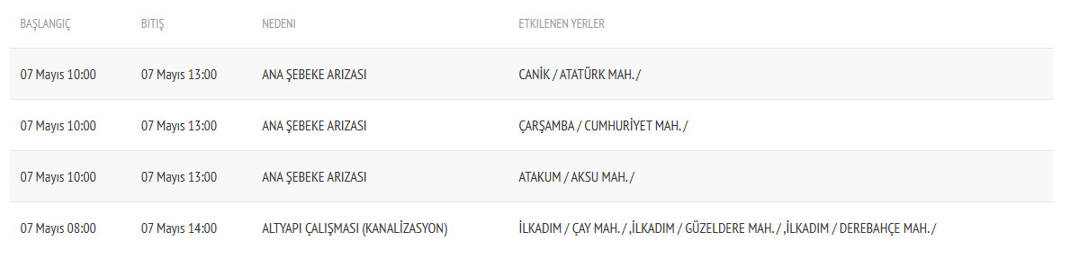 Canik Atatürk Mahallesi: 10:00 ile 13:00 saatleri arasında ana şebeke arızası nedeniyle su kesintisi yaşanacak.
