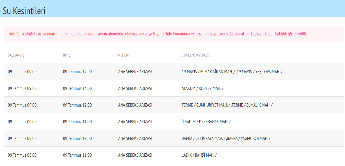 Atakum Körfez Mahallesi: 09:00 – 14:00 saatleri arasında ana şebeke arızası nedeniyle su kesintisi olacak.
