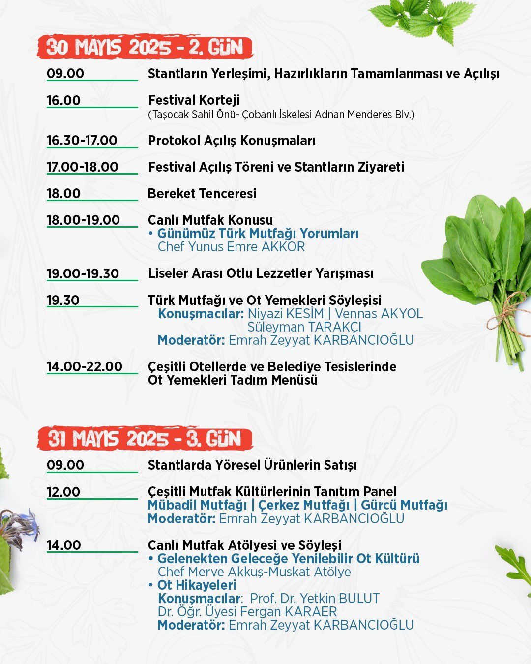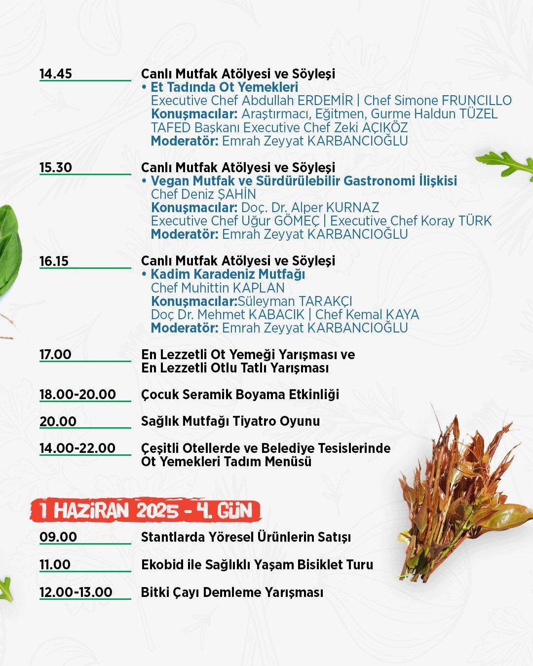 Doğadan sofraya uzanan lezzetlerin sergileneceği festivalde, Samsun’un yöresel ot yemekleri gastronomi tutkunlarıyla buluşacak. Festival kapsamında atölye çalışmaları, tadım etkinlikleri ve çeşitli aktivitelerle dolu dolu bir program ziyaretçileri bekliyor.