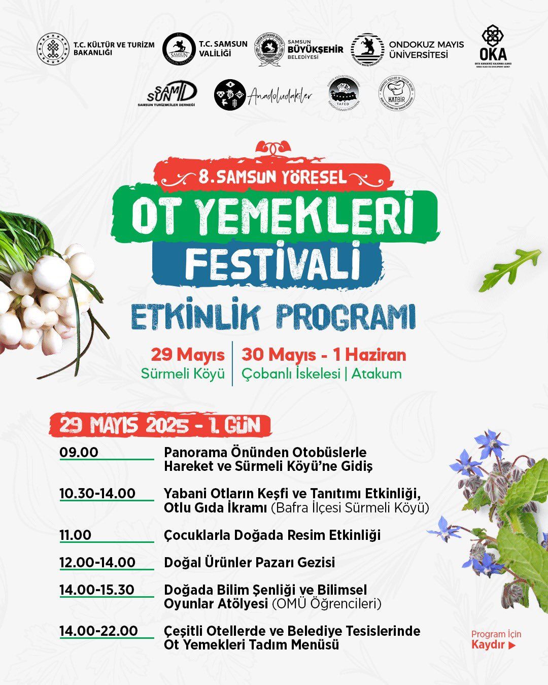 Samsun Büyükşehir Belediyesi öncülüğünde ve ilgili kurumların iş birliğiyle bu yıl 8’incisi düzenlenecek olan Samsun Yöresel Ot Yemekleri Festivali için hazırlıklar tamamlandı. Festival, 29 Mayıs'ta Bafra Sürmeli Köyü'nde başlayacak ve 30-31 Mayıs ile 1 Haziran tarihlerinde Atakum ilçesindeki Çobanlı İskelesi'nde devam edecek.