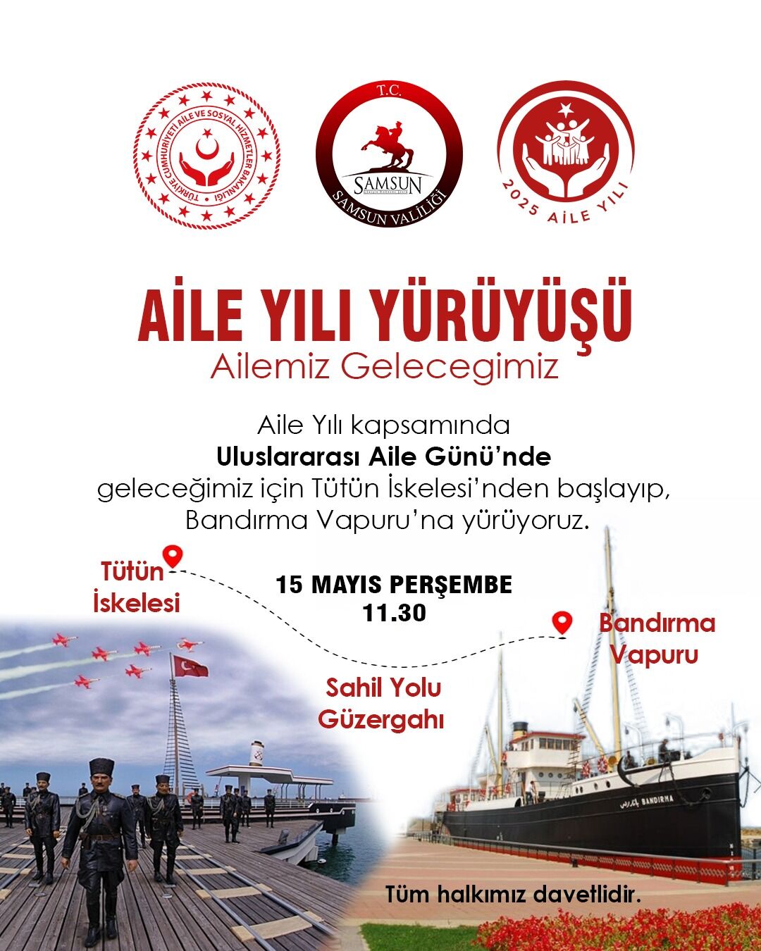 Aile ve Sosyal Hizmetler Bakanlığı ile Samsun Valiliği iş birliğinde organize edilen yürüyüş, sahil yolu güzergahı takip edilerek Bandırma Vapuru'nda son bulacak. “Ailemiz Geleceğimiz” sloganıyla gerçekleşecek etkinlikte, aile kurumunun önemine dikkat çekilmesi hedefleniyor.