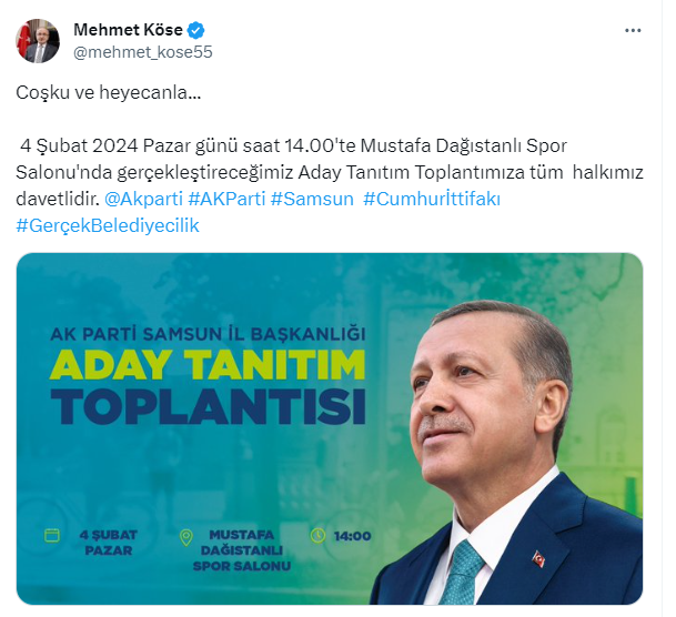 Köse, sosyal medya hesabından yaptığı açıklamada "4 Şubat 2024 Pazar günü saat 14.00'te Mustafa Dağıstanlı Spor Salonu'nda gerçekleştireceğimiz Aday Tanıtım Toplantımıza tüm halkımız davetlidir. " ifadelerini kullandı.