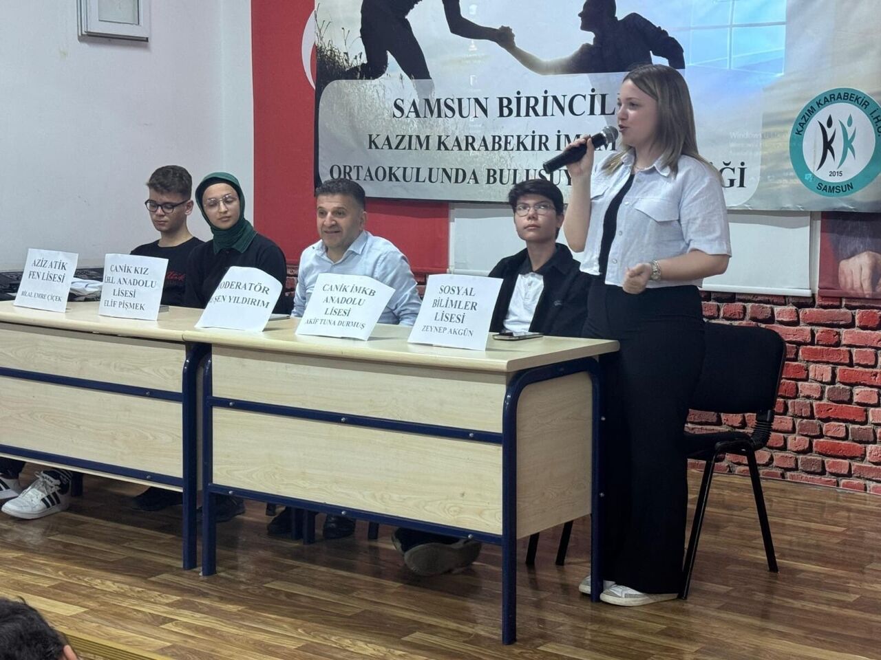 Samsun/İlkadım Kazım Karabekir İmam Hatip Ortaokulunda hayata geçirilen "Biz Kazandık Sıra Sizde" projesi, eğitimde akran öğretiminin gücünü gözler önüne seriyor. Milli Eğitim Bakanlığı Din Öğretimi Genel Müdürlüğü'nün "HEDEF 2025 Lise Giriş Sınav Projesi" kapsamında, Kazım Karabekir İmam Hatip Ortaokulu Rehberlik Servisi'nden Rehber Öğretmeni Ruşen Yıldırım tarafından hazırlanan bu proje, LGS'de başarı elde eden ve liseye birinci sırada yerleşen öğrencileri, ortaokul öğrencileriyle bir araya getirerek deneyim paylaşımını teşvik ediyor. Etkinlikte, İlkadım Aziz Atik Fen Lisesi 11. Sınıf öğrencisi Bilal Emre, Canik İMKB Anadolu Lisesi Akif Tuna Durmuş, Canik Kız İmam Hatip Lisesi Elif Pişmek ve Sosyal Bilimler Lisesi'nden Zeynep Akgün, LGS 11. sınıf okul birincisi öğrenciler, LGS'ye hazırlanan 8. sınıf öğrencileriyle buluştu. Bu buluşmada, öğrenciler kendi liselerini tanıttı, başarı hikayelerini paylaştı ve gelecekteki hedefleri hakkında bilgi verdi.