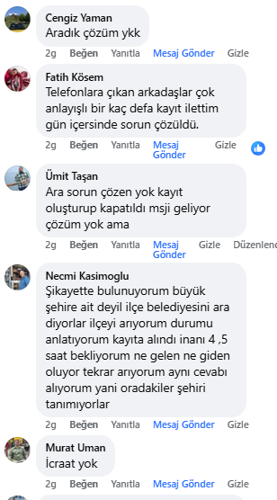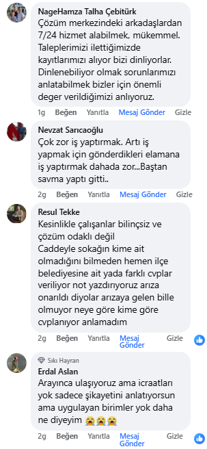 Bazı kullanıcılar ise ALO 153 hattını yönlendirme konusunda yetersiz buldu. Resul Tekke, “Çalışanlar caddeyle sokağın kime ait olduğunu bilmeden cevap veriyorlar. Arıza onarıldı deniyor ama gelen bile olmuyor” diyerek sürece dair güven sorunu yaşadığını belirtti.
