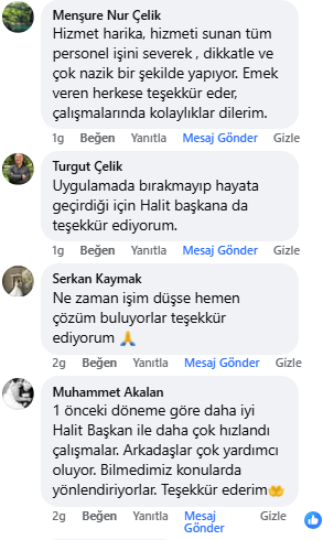 Yorumlar arasında hizmetten duyduğu memnuniyeti dile getirenler dikkat çekti. Menşure Nur Çelik, “Hizmet harika. Tüm personel işini severek, dikkatle ve çok nazik bir şekilde yapıyor. Emek veren herkese teşekkür ederim” diyerek memnuniyetini dile getirdi.