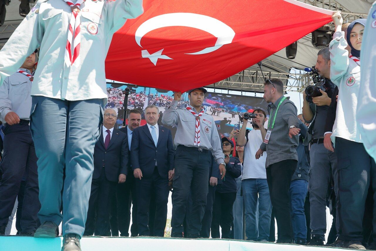 Samsun'da 19 Mayıs kutlamaları kapsamında, Gençlik ve Spor Bakanlığı ile Milli Savunma Bakanlığının ortak çalışması "TCG Anadolu ile Mavi Vatanda İstanbul'dan Samsun'a Milli Mücadele Yolculuğu"nda, Türkiye'nin en büyük yerli ve milli askeri gemisiyle 81 ilden Samsun’a gelen gençlerin taşıdığı Türk bayrağı askerlere teslim edildi.