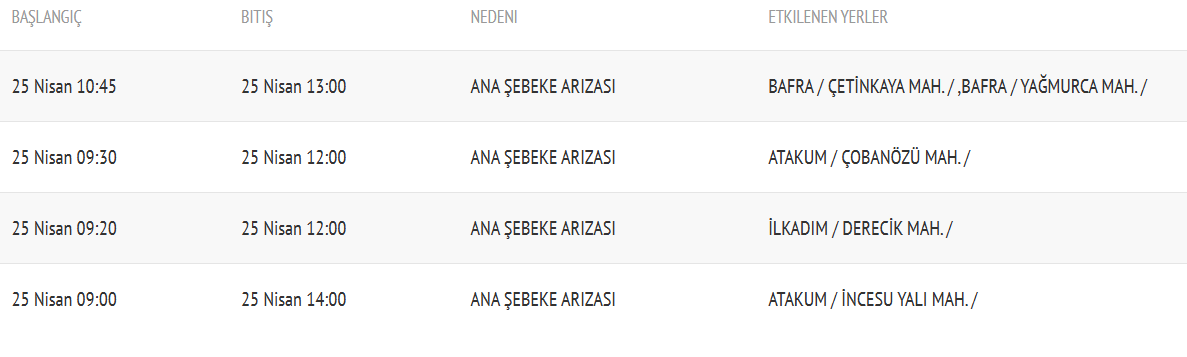 Yine Atakum ilçesine bağlı İncesu Yalı Mahallesi’nde ise saat 09.00 ile 14.00 arasında su verilemeyeceği bildirildi.
