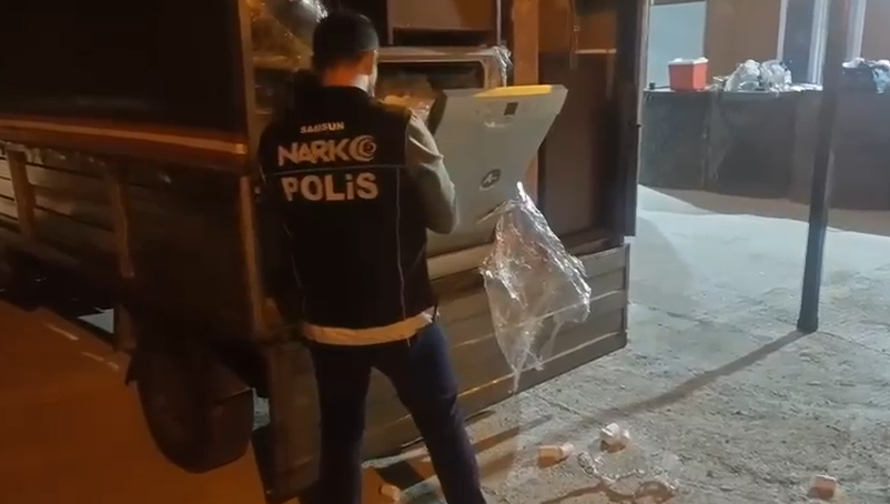 Polis ekipleri tarafından takibe alınan araç, Havza ilçesinde durduruldu. Olay yerine sevk edilen dedektör köpek TONY, aracın kasasında bulunan bazı eşyalara tepki verdi. Bunun üzerine ekipler, kasadaki eşyaları detaylı bir şekilde incelemeye aldı.