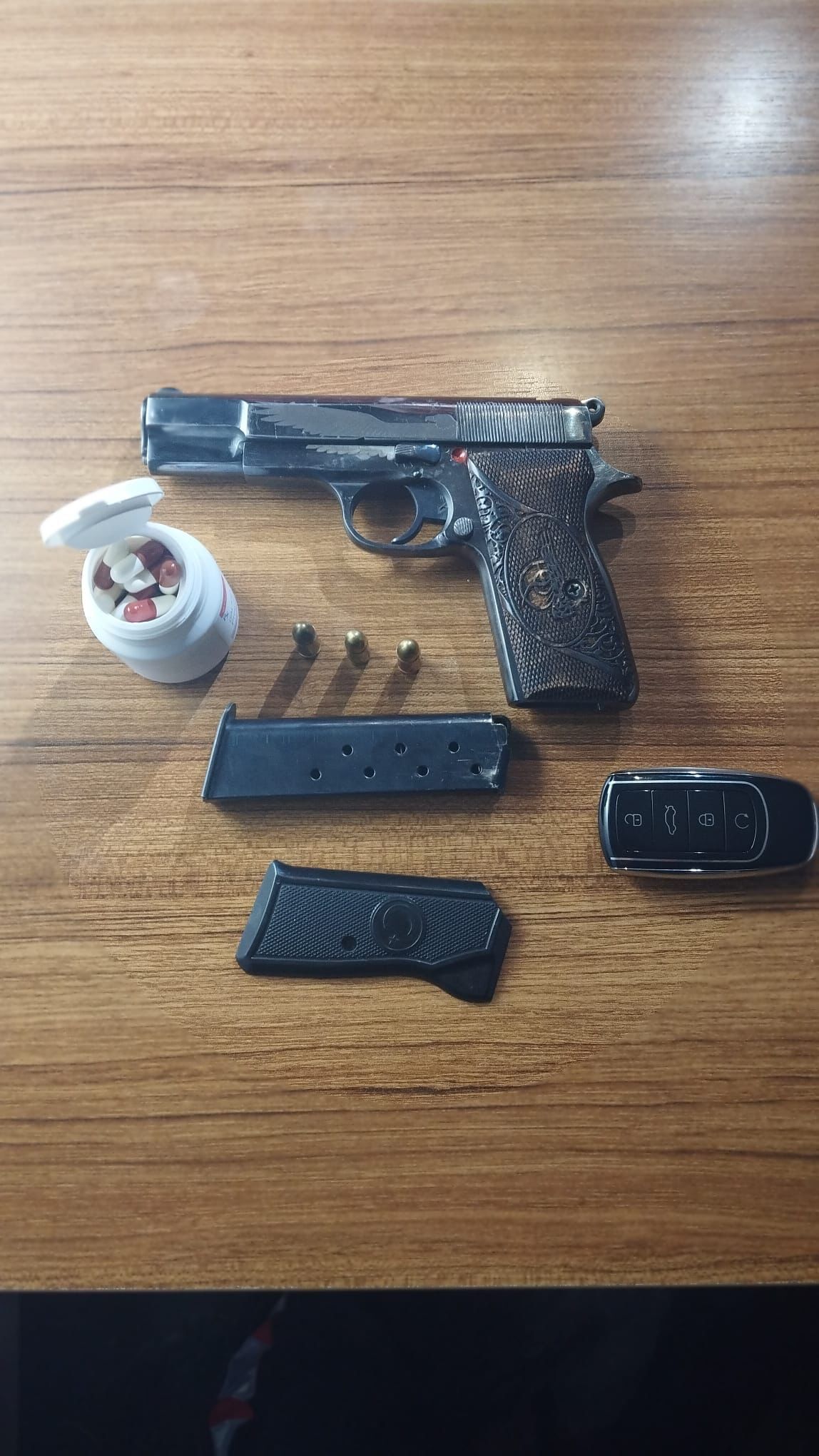 İş yerinde gerçekleştirilen aramalarda ise, 1 adet ruhsatsız tabanca, 3 adet fişek, 63 adet sentetik ecza hap, bir miktar metamfetamin maddesi ele geçirildi.