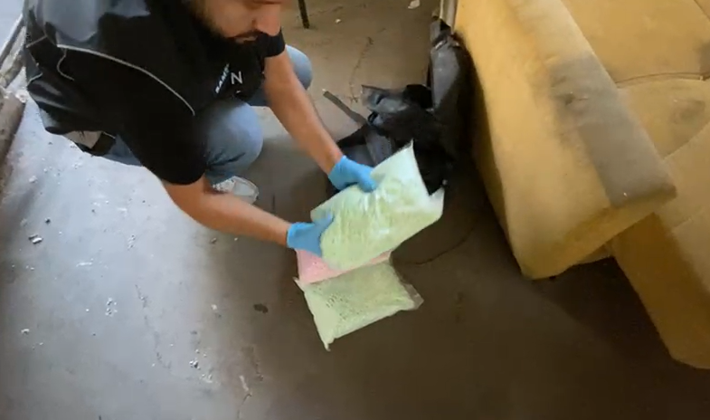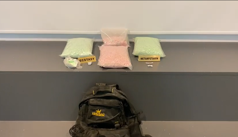 Çatı katında gerçekleştirilen aramada gizlenmiş halde 15 bin 878 adet extasy hap, 17,48 gram extasy tozu ve 0,39 gram metamfetamin ele geçirildi.